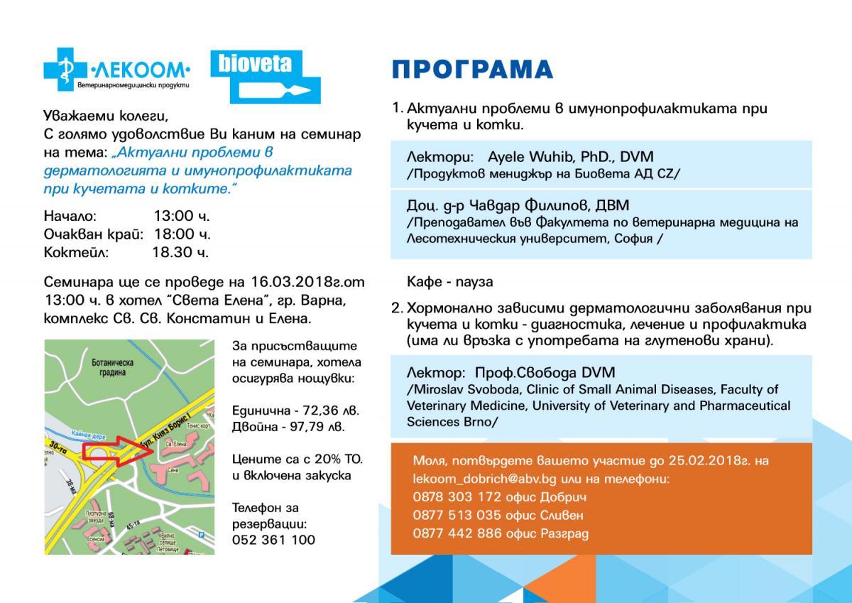 Invitation to seminar titled in “Current issues in dermatology and immunoprophylaxis of dogs and cats” that is going to take place on 16. 03. 2018 in Saints Constantine and Helena Resort, Varna, Bulgaria