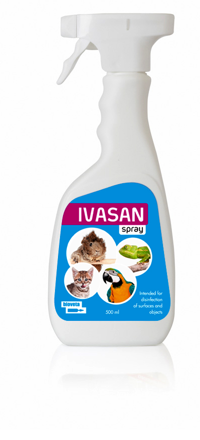 Spray on smelly and dirty places and let it act for at least 15 minutes. It is not necessary to wash or otherwise treat the treated place after application. In the event that your four-legged friend fouled its crate or bed, it is good to apply the IVASAN Spray and let it act for at least fifteen minutes before washing. This method of application ensures a hundred percent cleanness without any odour. The IVASAN Spray is also gentle to small mammals, birds and reptiles, so it can safely be used to disinfect their breeding facilities. After a short exposure wipe or rinse the product of the treated surface, and the surface can come into immediate contact with an animal.