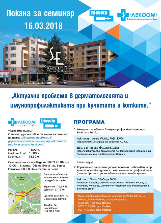 Invitation to seminar titled in “Current issues in dermatology and immunoprophylaxis of dogs and cats” that is going to take place on 16. 03. 2018 in Saints Constantine and Helena Resort, Varna, Bulgaria