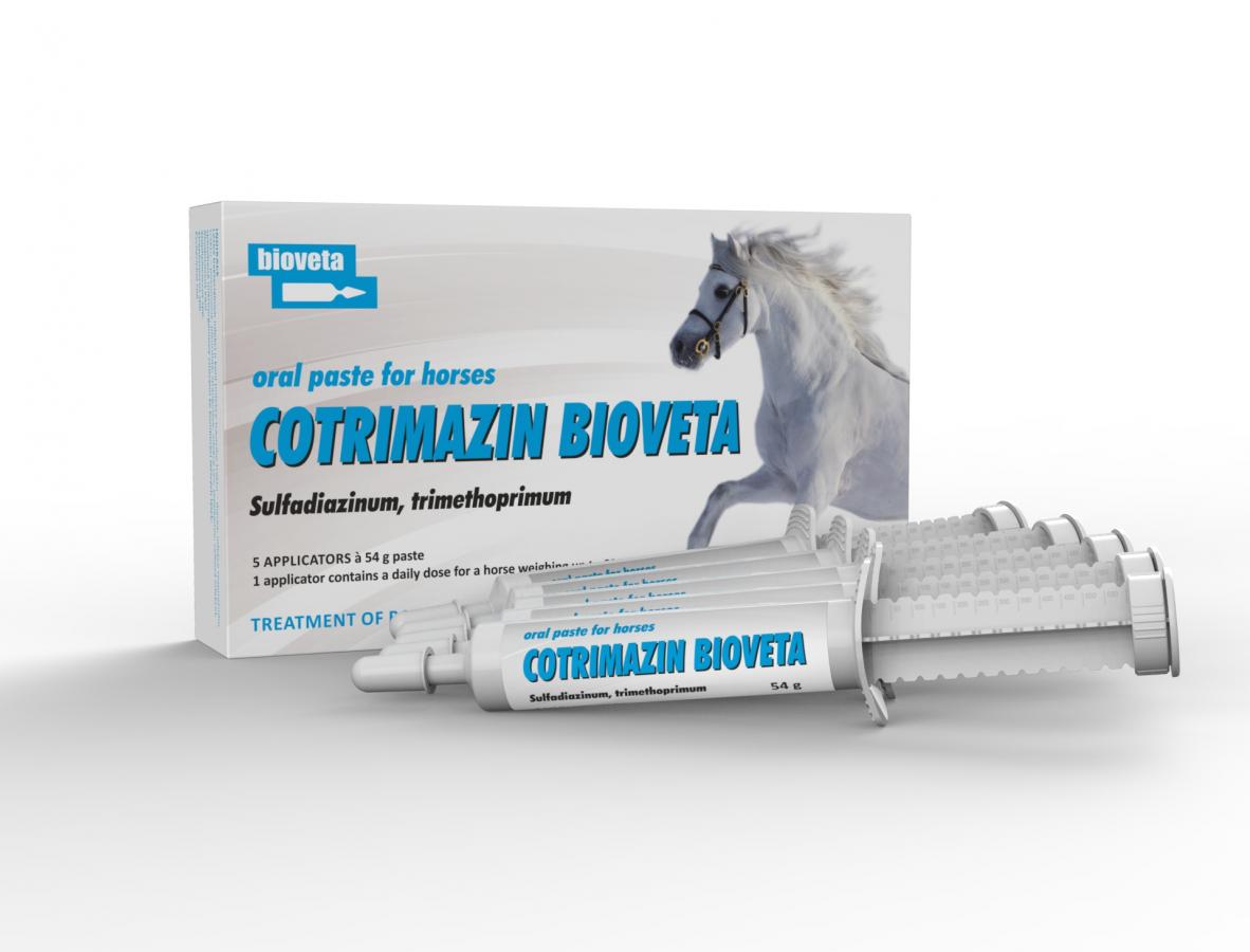 Homepage Products Veterinary products COTRIMAZIN Bioveta 288.2/58.0 mg/g oral paste Trimethoprimum, sulfadiazinum