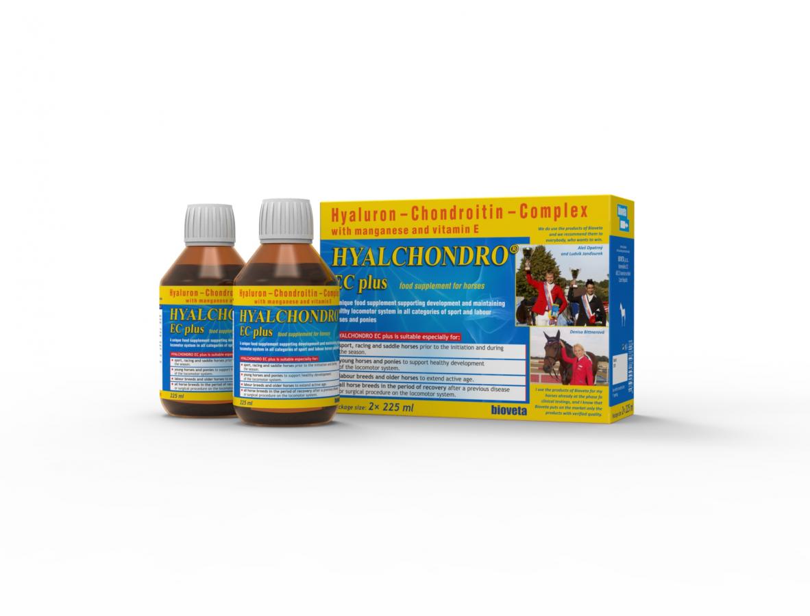 Regular administration of HYALCHONDRO EC plus improves mobilisation and in a certain extent also relief of pain, which accompanies the diseases or degenerative changes of the locomotor system of the horses. The regeneration process of the locomotor system and simultaneous elimination of arthritic pain takes place individually, apart from others also in relation to the extent of the damage, physical condition and age of the animal. As early as after a four-week administration of the preparation, there is an evident improvement of the complaints and relief of pain. In case of recurrent complaints it is recommended to restart the administration of the preparation after a 3-4-month interruption.